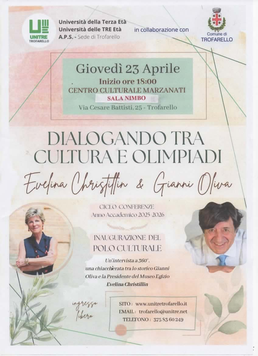 CONFERENZA POMERIDIANA alle ORE 18:00 con Evelina Christellin, la celebre Dirigente d’Azienda in ambito pubblico e sportivo che annovera nel suo percorso professionale più incarichi di alto impegno e prestigio dall’organizzazione delle Olimpiadi Invernali di Torino 2006 alla gestione del Museo Egizio, di cui si racconterà nell’ambito di una chiacchierata amichevole con il trofarellese Gianni OLIVA.